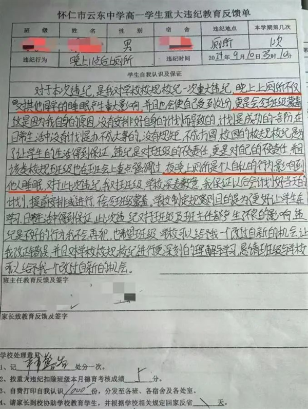 “以东说念主为本”的教师理念,不成仅停留在标语上,更应当体现时日常料理的细节之中。 “晚上上茅厕不仅对其他同学的寝息产生首要影响……更是会令班级蒙羞”“夜晚上茅厕是个自利的作为,影响到他东说念主寝息”……近日,山西一高中学生因夜晚上茅厕被定违法,并写下了这么的“自我走漏及保证”,激励社会热议。 对此,涉事学校智育处责任主说念主员暗意,9月10日,该校别称学生因在当晚11点10分足下上茅厕,被记严重...