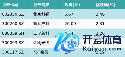 实现收盘九游体育娱乐网,HJT电板主题涨跌幅最高的五只股票为:北京科锐(002350.SZ)、新莱应材(300260.SZ)、三孚新科(688359.SH)、金刚光伏(300093.SZ)与*ST嘉寓(300117.SZ)。细目见下表: