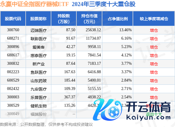 永赢中证全指医疗器械ETF为指数型-股票基金,字据最新一期基金季报清楚,该基金钞票确立:股票占净值比99.8%,无债券类钞票,现款占净值比0.24%。基金十大重仓股如下: