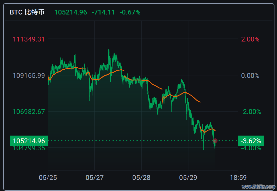 比特币在进取波及11万好意思元高点后调和回调,最新报105200好意思元/枚控制。