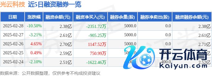 光云科技融资融券信息流露,融资方面,当日融资买入3030.9万元,融资偿还5382.63万元,融资净偿还2351.72万元。融券方面,融券卖出0.0股,融券偿还0.0股,融券余量5000.0股,融券余额7.42万元。融资融券余额2.38亿元。