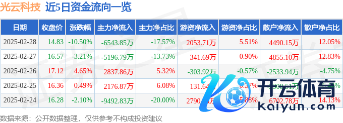 本站讯息,放浪2025年2月28日收盘,光云科技(688365)报收于14.83元,下降10.5%,换手率5.71%九游体育娱乐网,成交量24.31万手,成交额3.73亿元。
