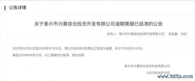 据上海单子往复所裸露,2025 年 2 月 1 日至 7 月 31 日历间,发生 3 次以上单子过时且月末有过时余额或当月有过时看成的承兑东说念主共计 991 家,兴黄投资初度出目下该名单中。8 月 15 日,兴黄投资发布公告示意," 2025 年 02 月 01 日至 2025 年 07 月 31 日,我公司承兑的 3 张交易汇票发生过时,共计 1753 万元。收尾 2025 年 08 月 15 日,以上单子均已结清。"